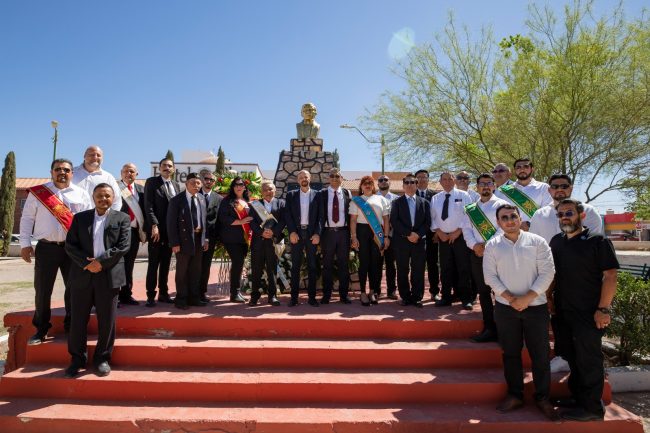 El alcalde José Manuel Quijada Lamadrid encabezó el evento organizado por la Dirección de Educación y Cultura, donde autoridades municipales, representantes de logias masónicas y ciudadanía, se dieron cita para rendir homenaje frente al monumento del Benemérito de las Américas.
