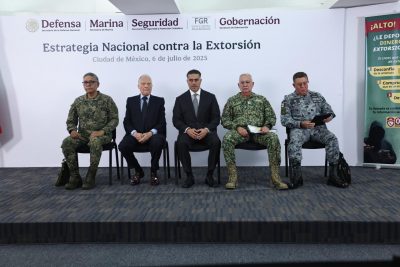 Durante la presentación de la Estrategia Nacional contra la Extorsión, el titular de la Secretaría de Seguridad y Protección Ciudadana (SSPC) estuvo acompañado por los mandos del Gabinete de Seguridad: el secretario de la Defensa Nacional, general Ricardo Trevilla Trejo; el secretario de Marina, almirante Raymundo Pedro Morales; el fiscal General de la República, Alejandro Gertz Manero; y el comandante de la Guardia Nacional, general Hernán Cortés Hernández.