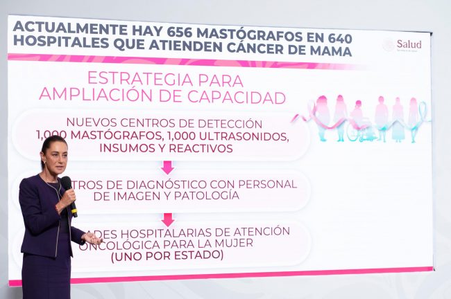 Ciudad de México, 21 de octubre de 2025.- La Presidenta Claudia Sheinbaum Pardo anunció una inversión de 8 mil millones de pesos (mdp) que se destinará al Modelo de Atención Universal de Cáncer de Mama, que marcará un antes y un después en la atención de esta enfermedad, que en México es la principal causa de muerte en mujeres, y para ello se adquirirán, entre 2026 y 2027, mil mastógrafos, mil ultrasonidos, —que se sumarán a los 656 mastógrafos que ya están en operación en 640 hospitales—, que estarán en los Nuevos Centros de Detección, además se aperturarán 20 Centros de Diagnóstico con personal de imagen y patología para la interpretación de los estudios y se construirán 32 Unidades Hospitalarias de Atención Oncológica para la mujeres, uno en cada estado.