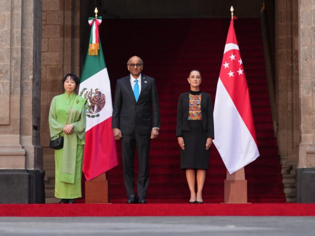Ciudad de México, 1 de diciembre de 2025.- La Presidenta de México, Claudia Sheinbaum Pardo, recibió en Palacio Nacional a su homólogo de la República de Singapur, Tharman Shanmugaratnam, con quien posteriormente sostendrá una reunión privada, así como un encuentro con empresarios de ambas naciones.